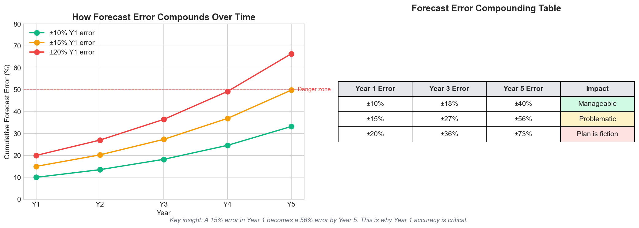 If your Year 1 projection is off by 15%, your Year 5 projection isn't off by 15%—it's off by 50-80%.