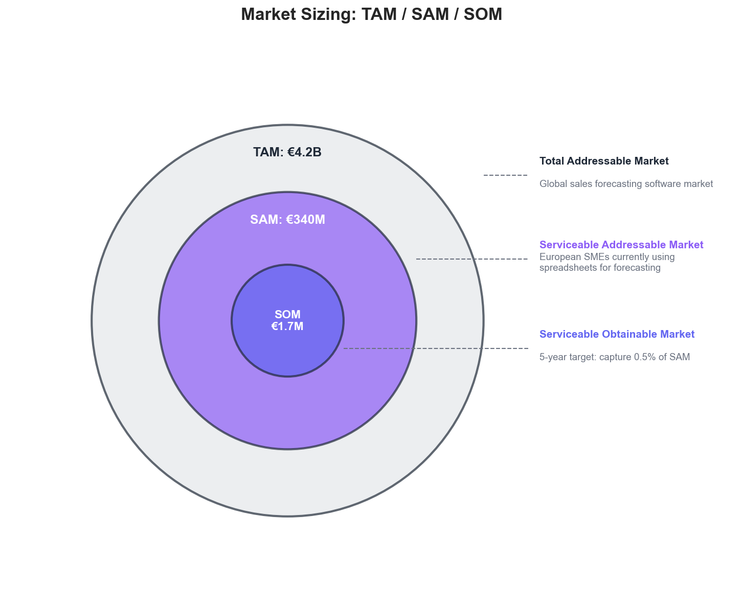 - SOM (Serviceable Obtainable Market): What you can capture in 5 years. "We target 0.02% of SAM = €840K revenue by Year 5."