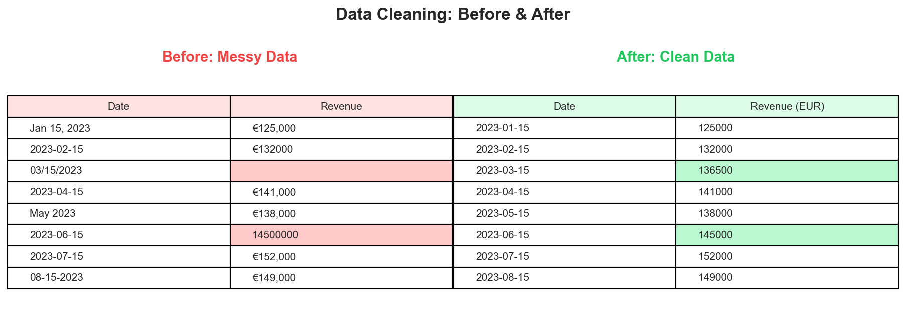 A typical data cleaning transformation: inconsistent dates, missing values, and unit errors become standardized, complete records.