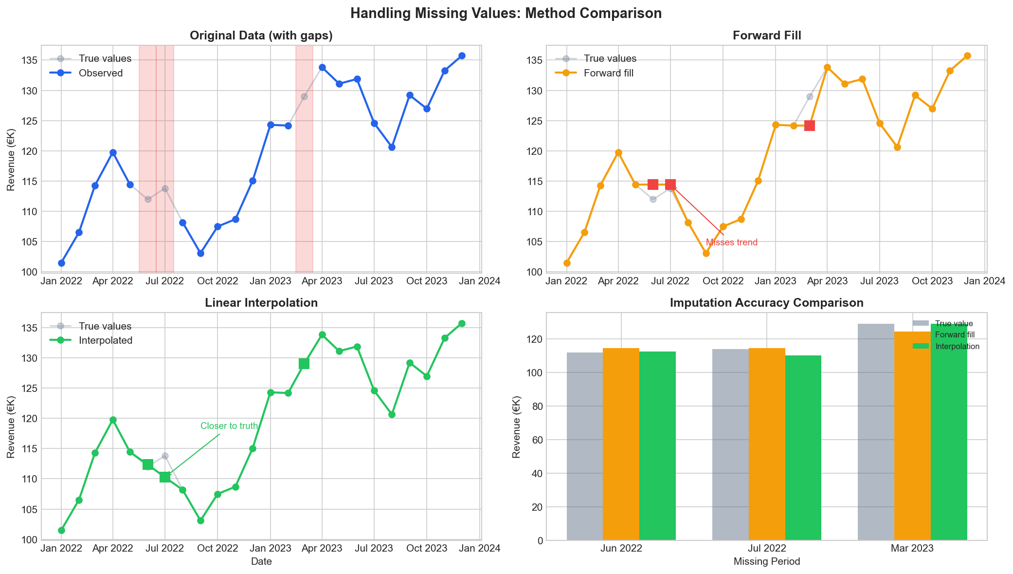 Different imputation methods produce different results. Forward fill preserves the last value but misses trends. Linear interpolation often gets closer to the truth for trending data.