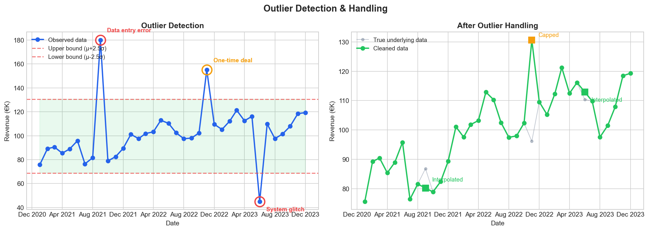 Not all outliers are errors. The "one-time deal" at €155K is real business activity worth capping, while the €180K and €45K values are data errors that should be removed and interpolated.