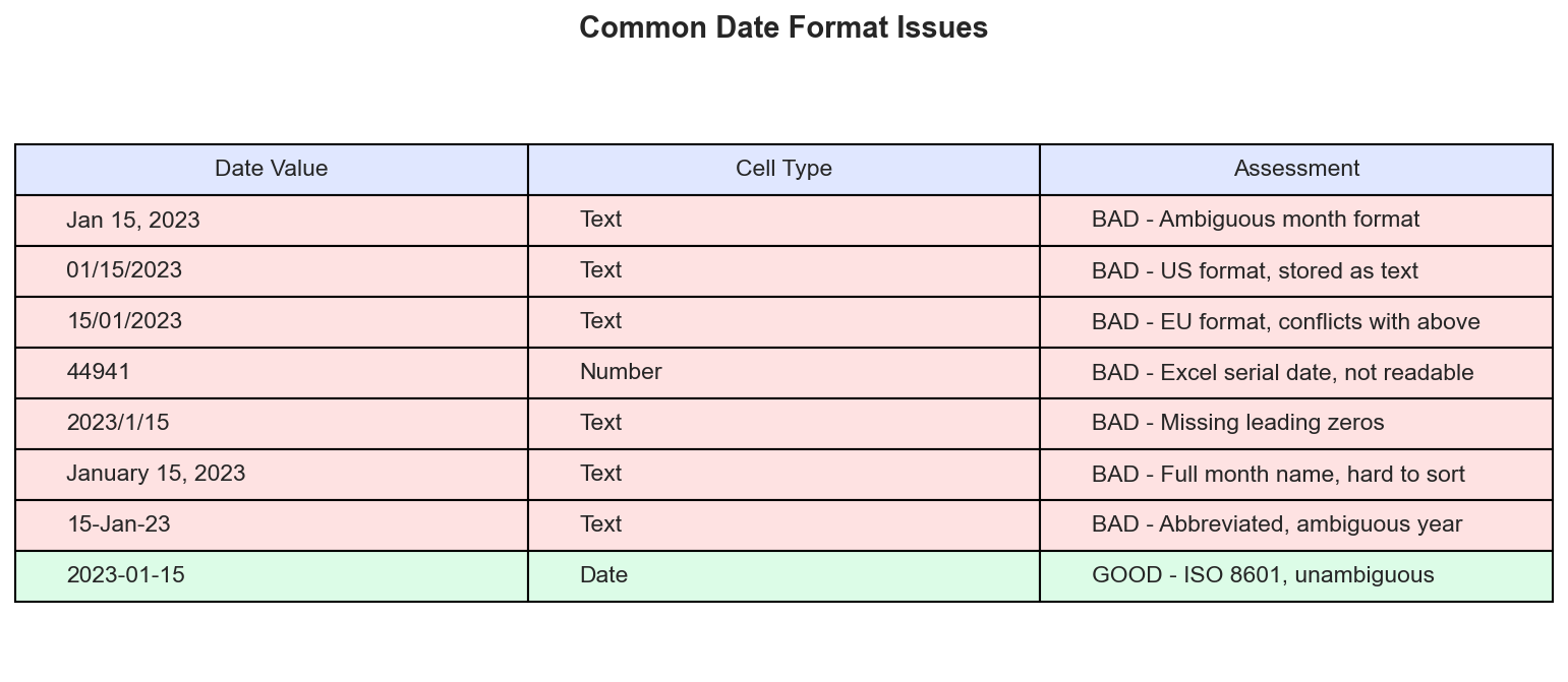 Date inconsistencies cause more silent failures than any other data issue. A forecasting model expecting "2023-01-15" will fail unpredictably on "01/15/2023" — sometimes crashing, sometimes producing nonsense results without warning.