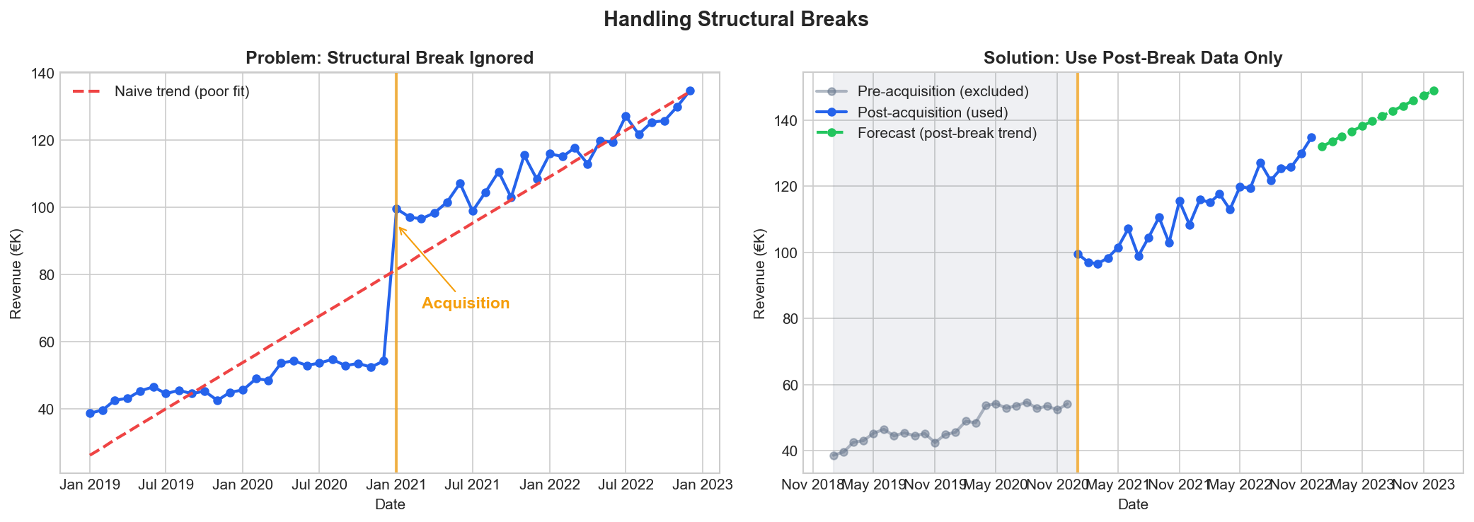 An acquisition in 2021 changed the revenue base. Training on all data produces a poor trend line. Using only post-acquisition data gives a reliable forecast.