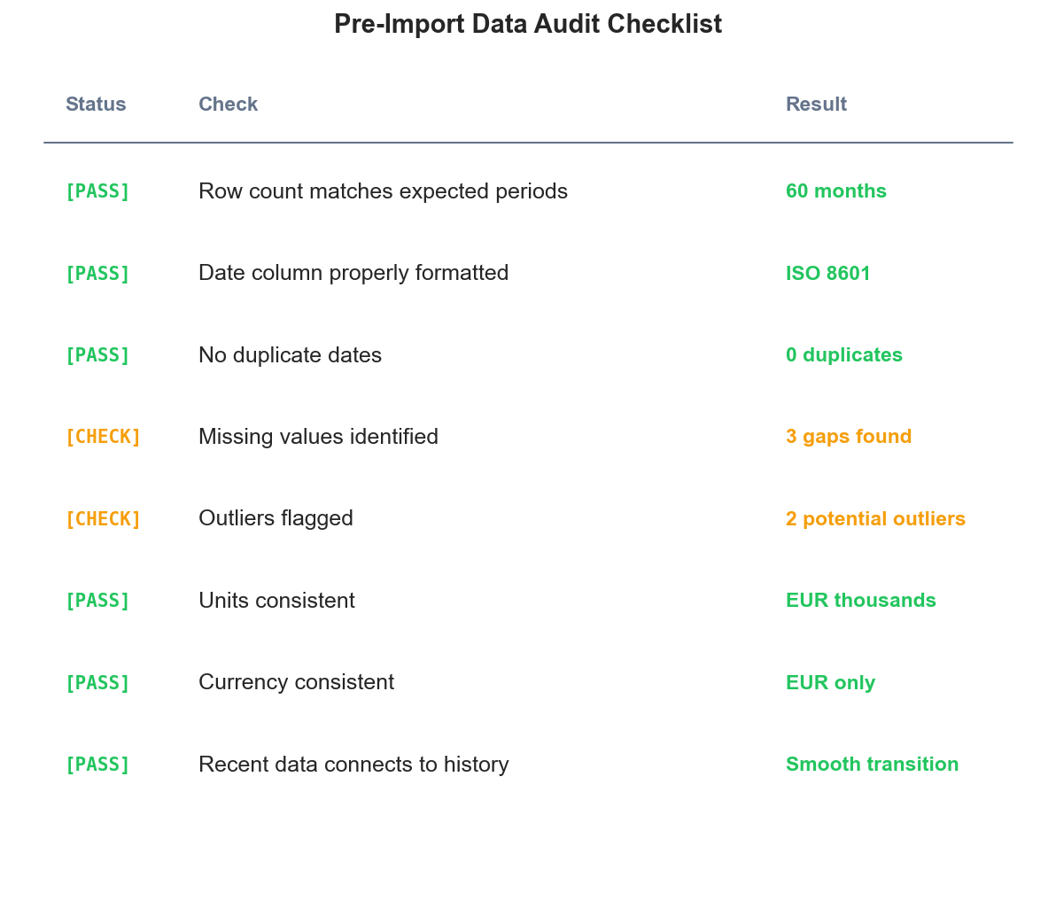 A sample pre-import checklist. Green items pass validation; amber items need attention before forecasting.