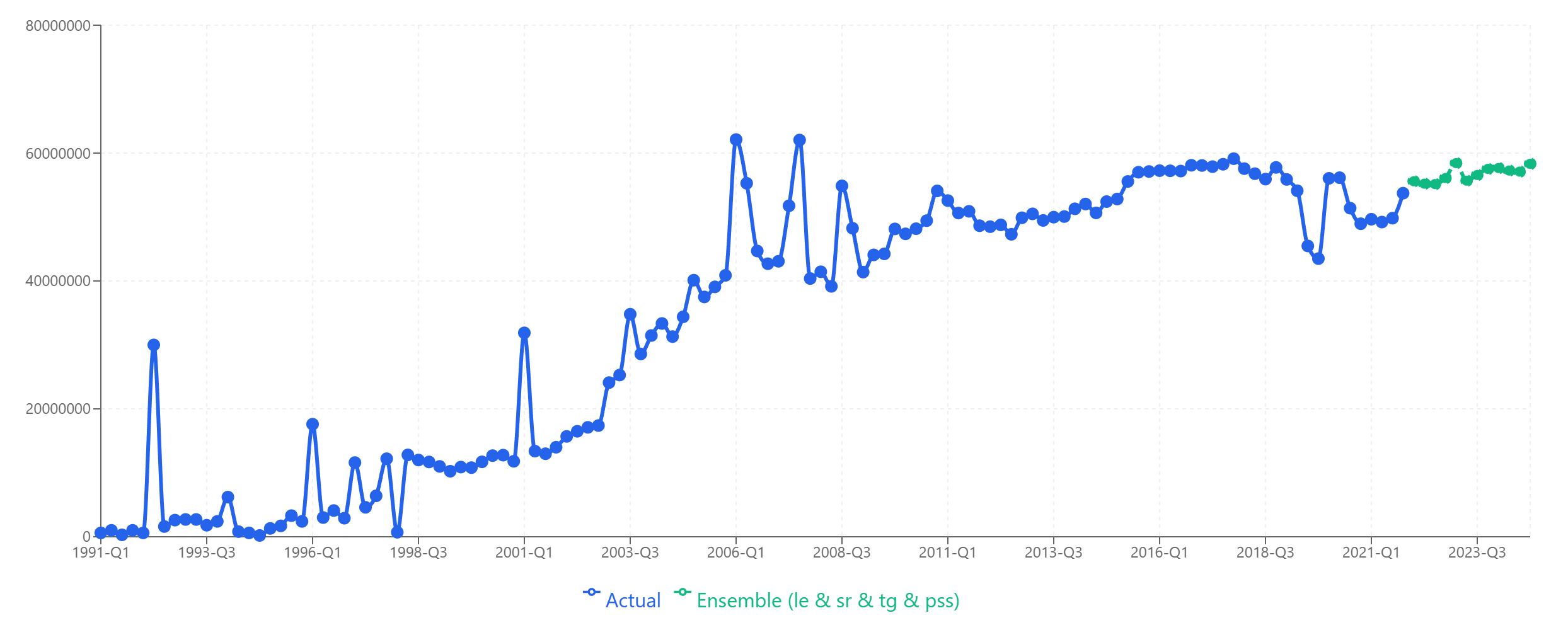 Let's look at actual quarterly revenue data spanning 30+ years. We trained all four models and generated forecasts for 12 quarters (2022-Q1 through 2024-Q4), then compared predictions against actual results.
