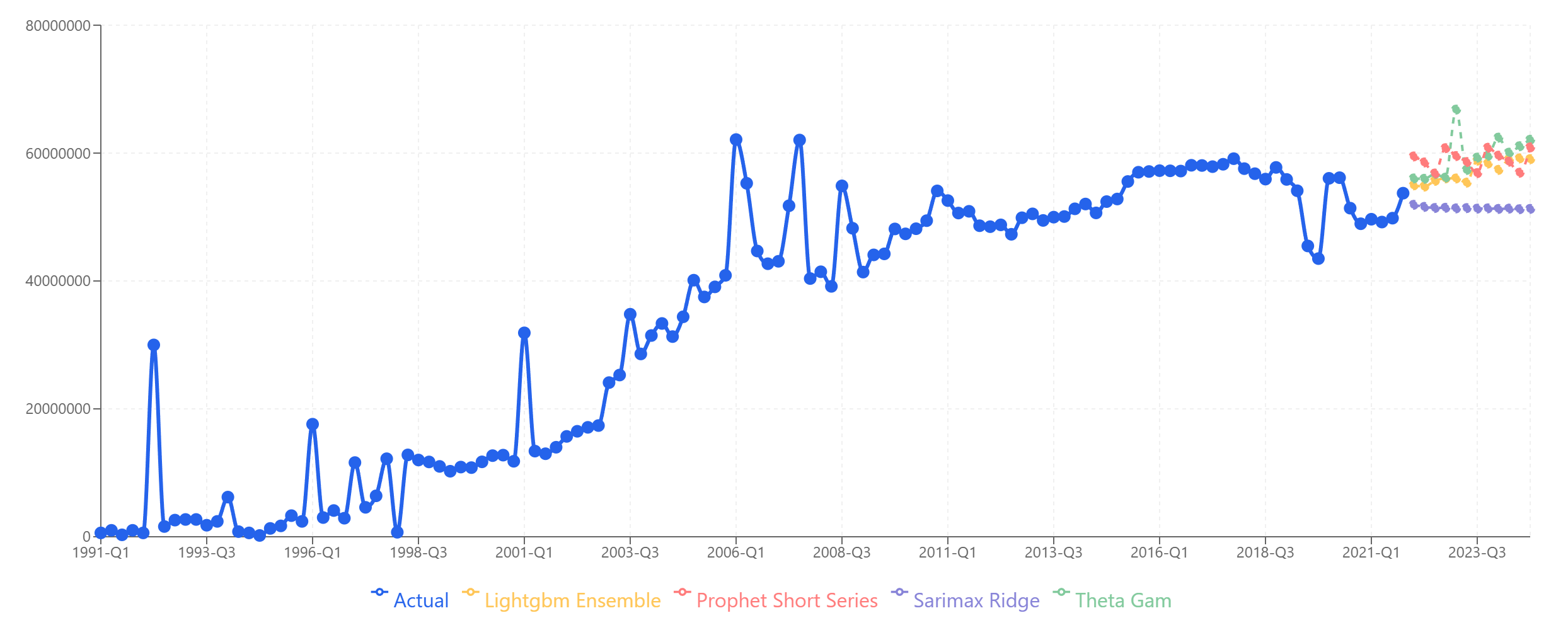 | Period | LightGBM | SARIMAX | Theta-GAM | Prophet | Ensemble | Actual |