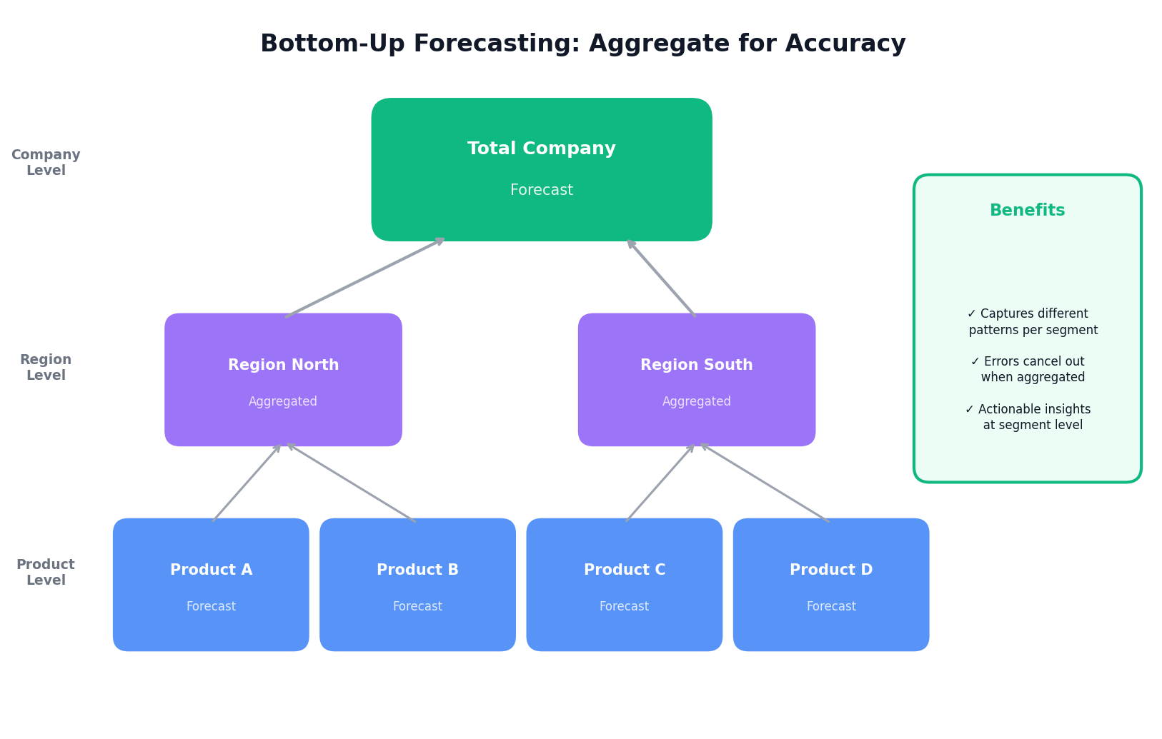 Instead of forecasting total company revenue as a single number, forecast by product line, region, customer segment, or sales channel—then aggregate upward.