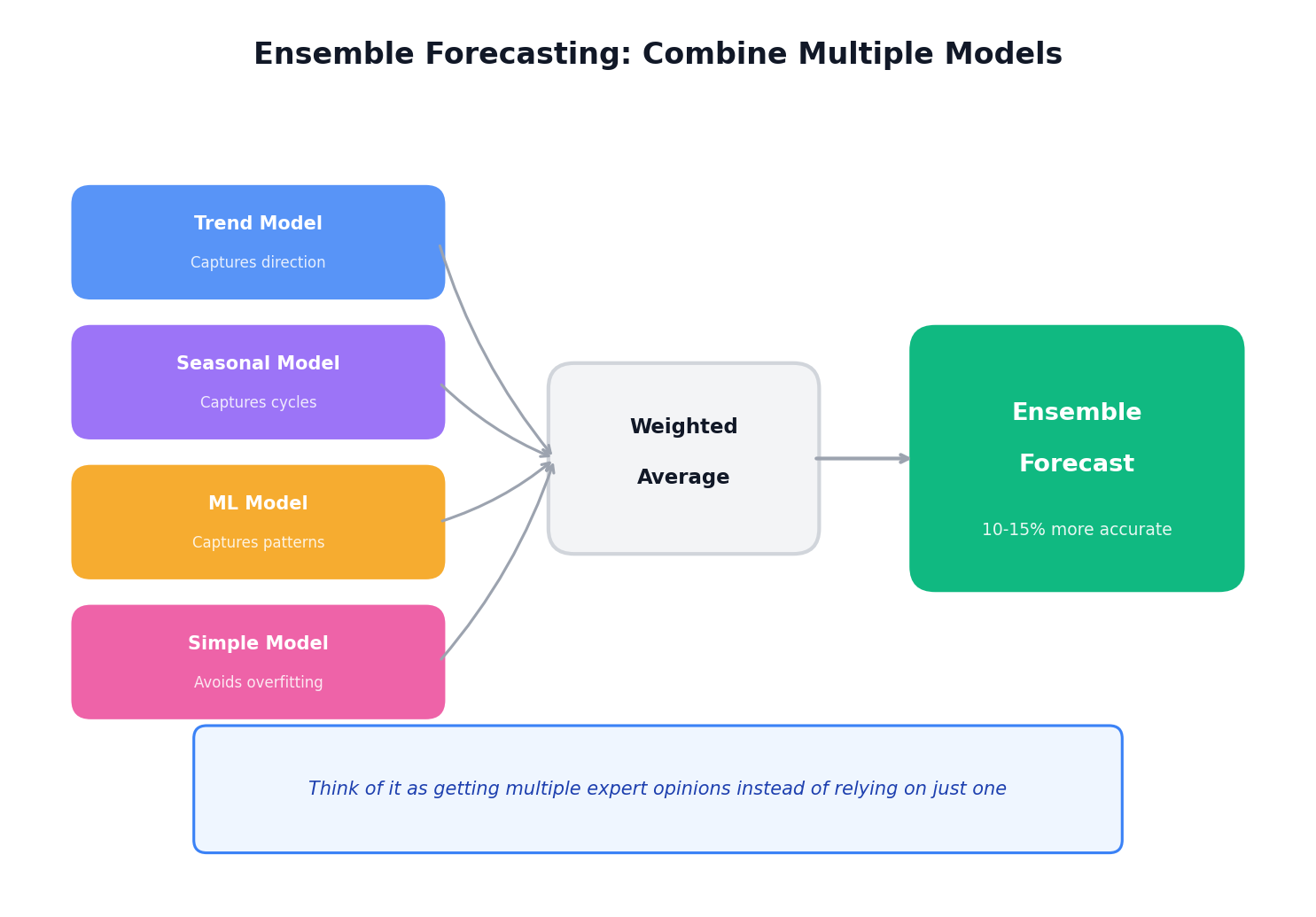 Combining forecasts from multiple models—an ensemble approach—typically outperforms any individual model by 10-15%. The ensemble averages out individual model biases and captures different aspects of the underlying pattern.