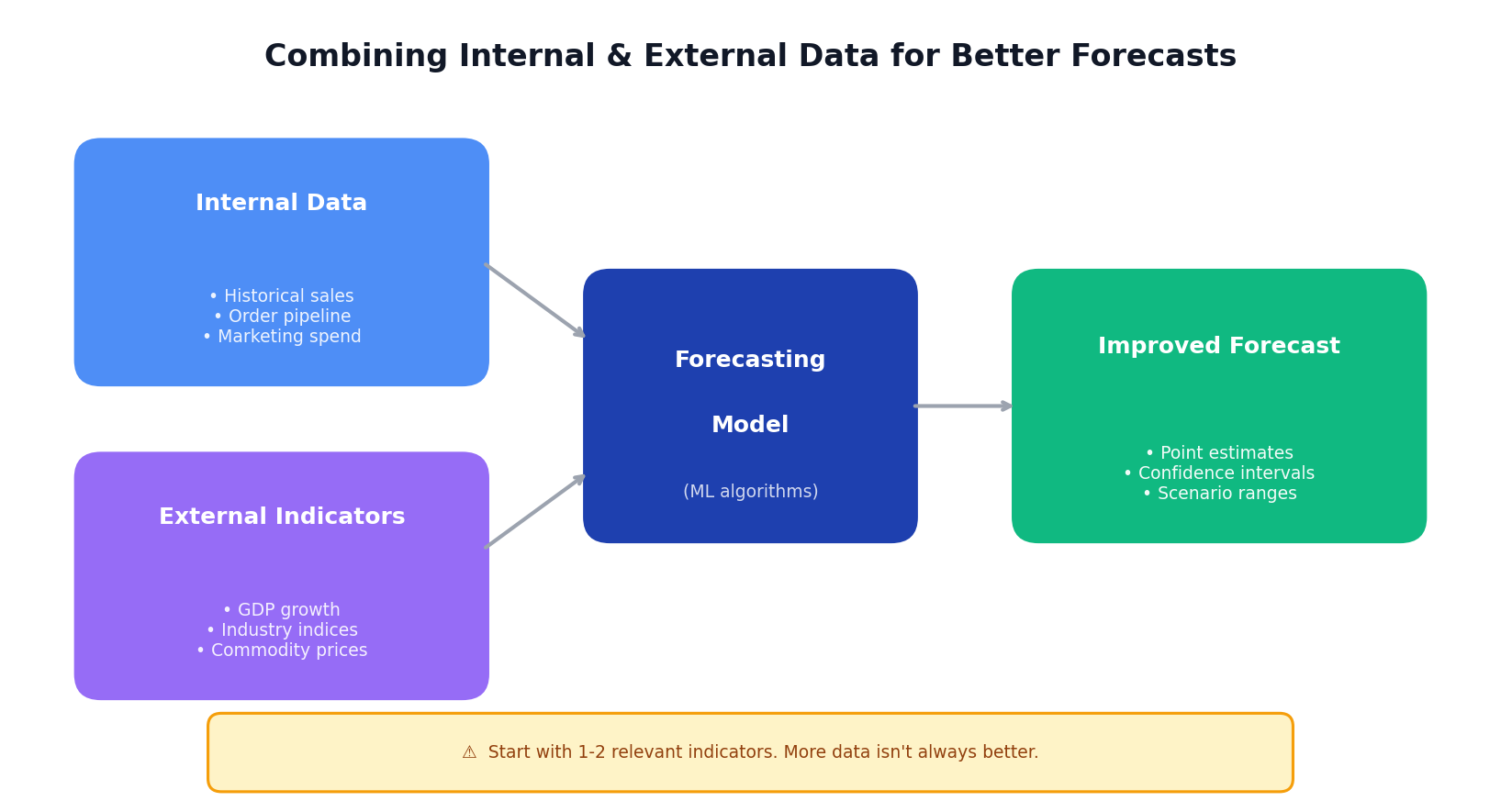 Your sales don't exist in a vacuum. They respond to economic conditions, industry trends, commodity prices, and competitive dynamics. Incorporating relevant external data can improve forecasts, especially for longer horizons where internal patterns become less reliable.