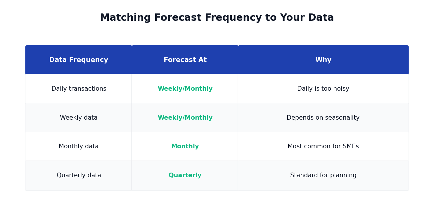 Quarterly revenue doesn't require daily forecasts. Monthly sales data shouldn't be forced into annual buckets. Matching your forecast frequency to your data's natural rhythm improves accuracy and reduces noise.