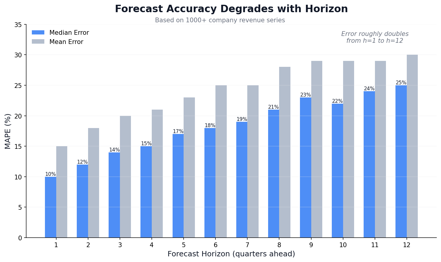 Median error roughly doubles from 10% at one quarter ahead to 25% at twelve quarters out. The degradation is gradual and predictable, which means you can plan for it.