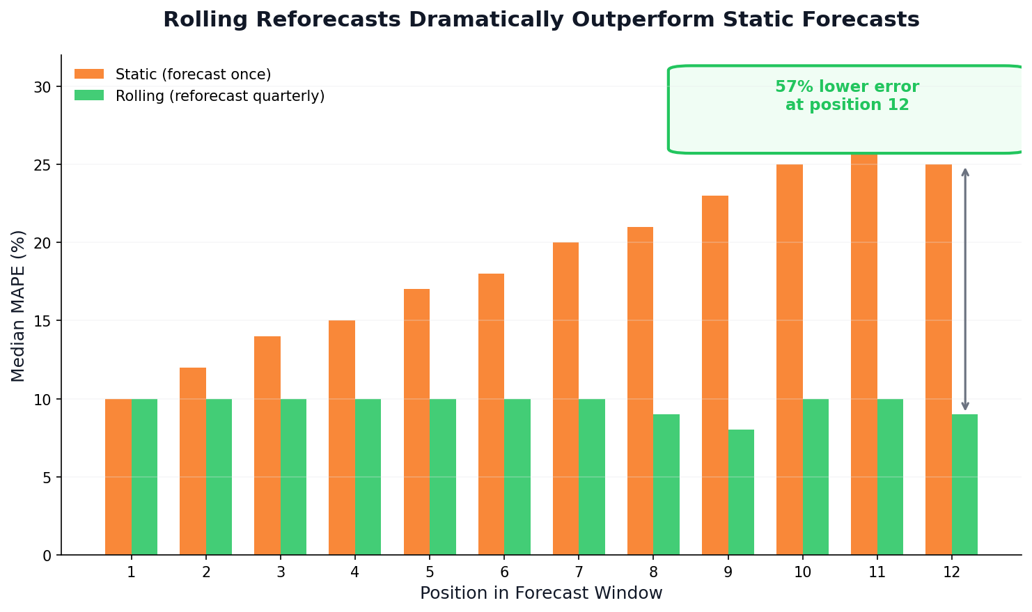 At position 12 in the forecast window, rolling reforecasts showed 57% lower error than static forecasts. The rolling approach maintains roughly 10% MAPE throughout, while static forecasts degrade to 25%+.