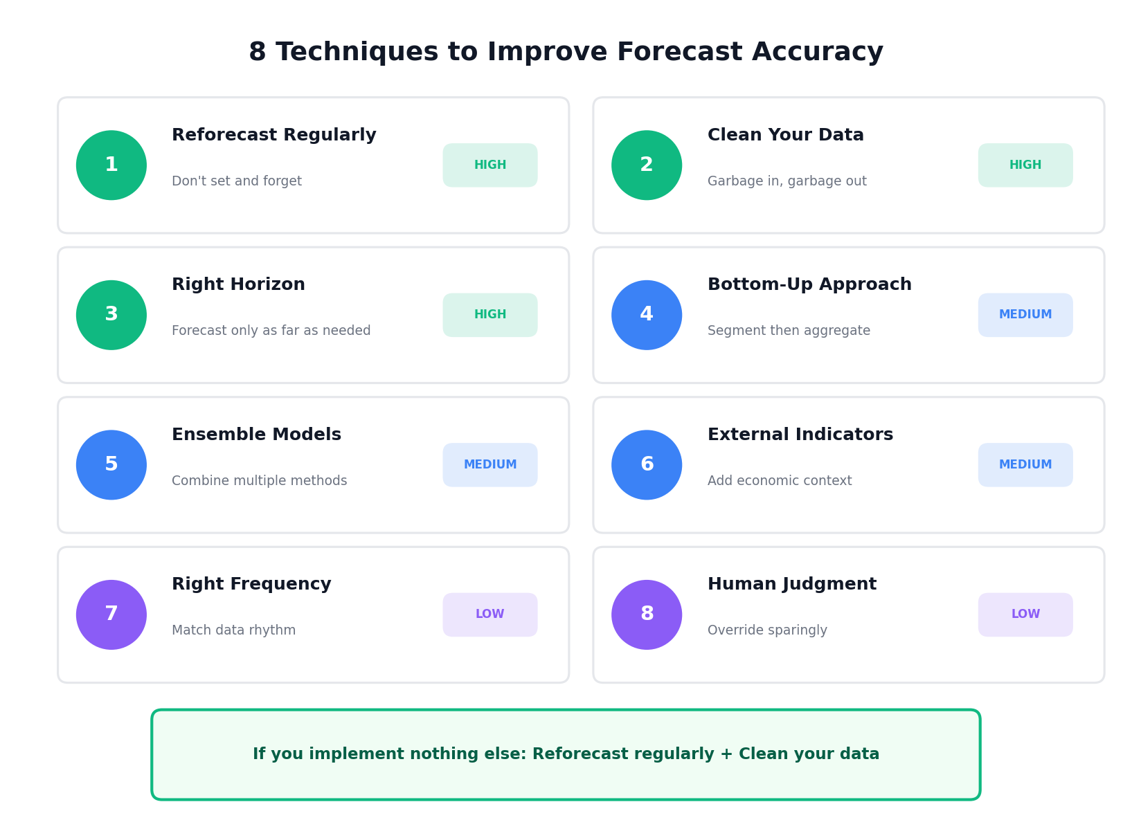 This is the single highest-impact technique we've found. A forecast created once and never updated will drift further from reality with each passing period. A forecast refreshed with new actuals stays accurate.