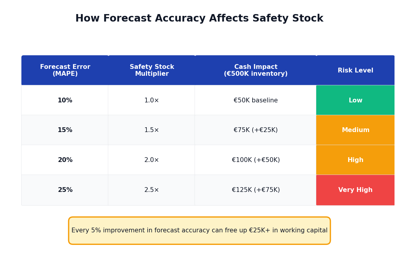 The table above shows the real impact. At 25% forecast error (MAPE), you need nearly 2.5x more safety stock than at 10% error. That's cash sitting in your warehouse instead of growing your business.
