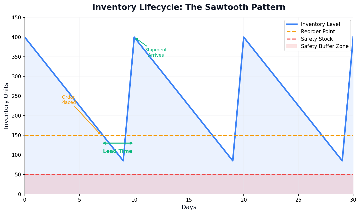 This classic "sawtooth" pattern shows how inventory planning works in practice: