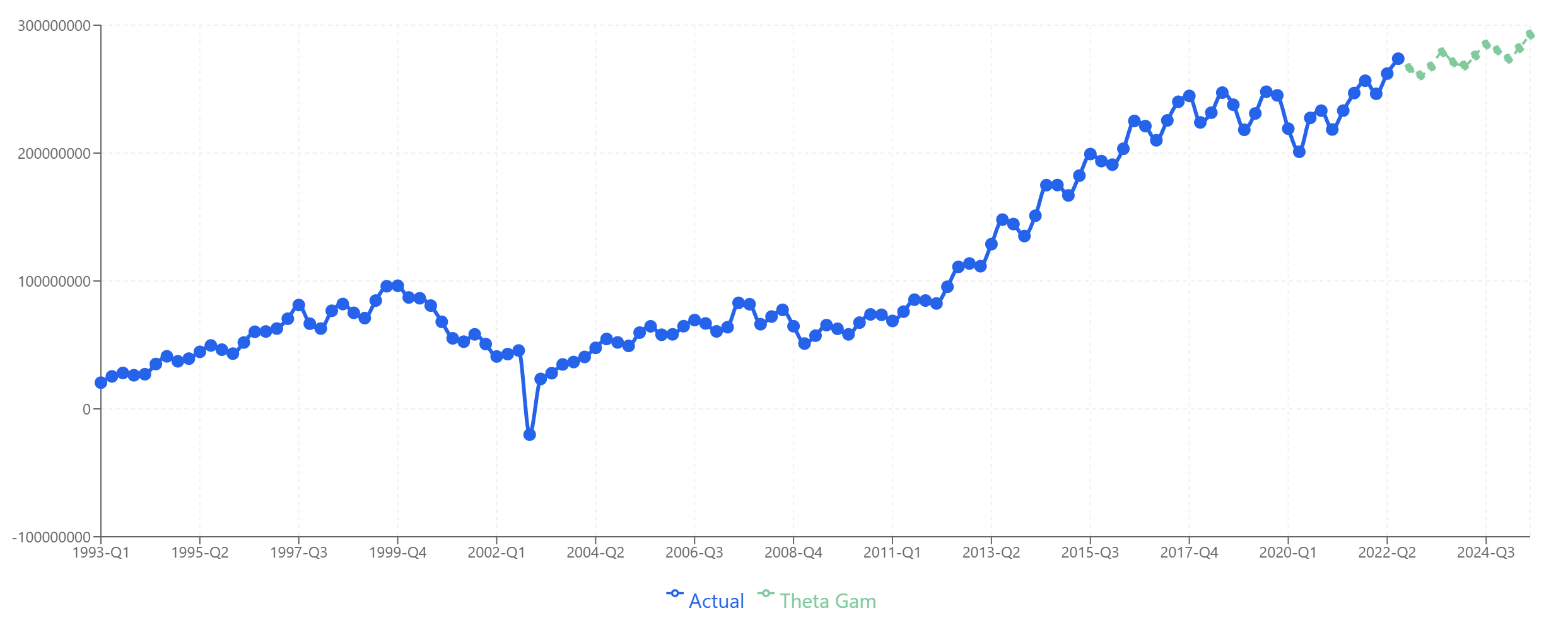 - Product A: Theta-GAM — Captures the growth trend well and projects reasonable continuation.