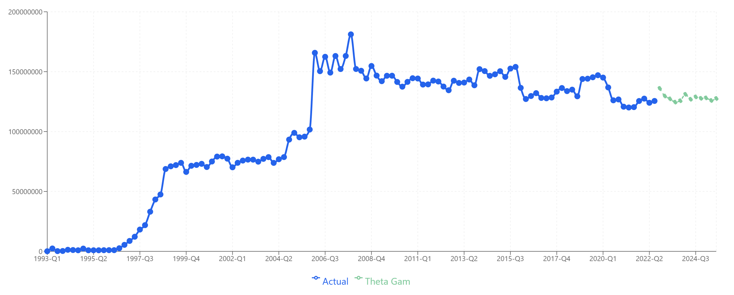 Product A: Theta-GAM extrapolates the growth trend established since 2010.