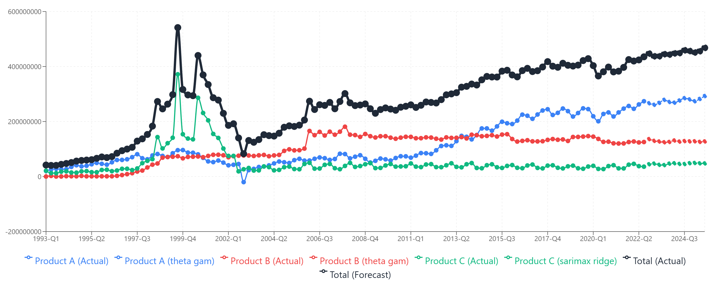 This happens because the total series combines the dot-com spike from Product A, the plateau from Product B, and the growth from Product C into one messy signal. The models are trying to learn from a composite pattern that doesn't have the clean structure of any individual component.