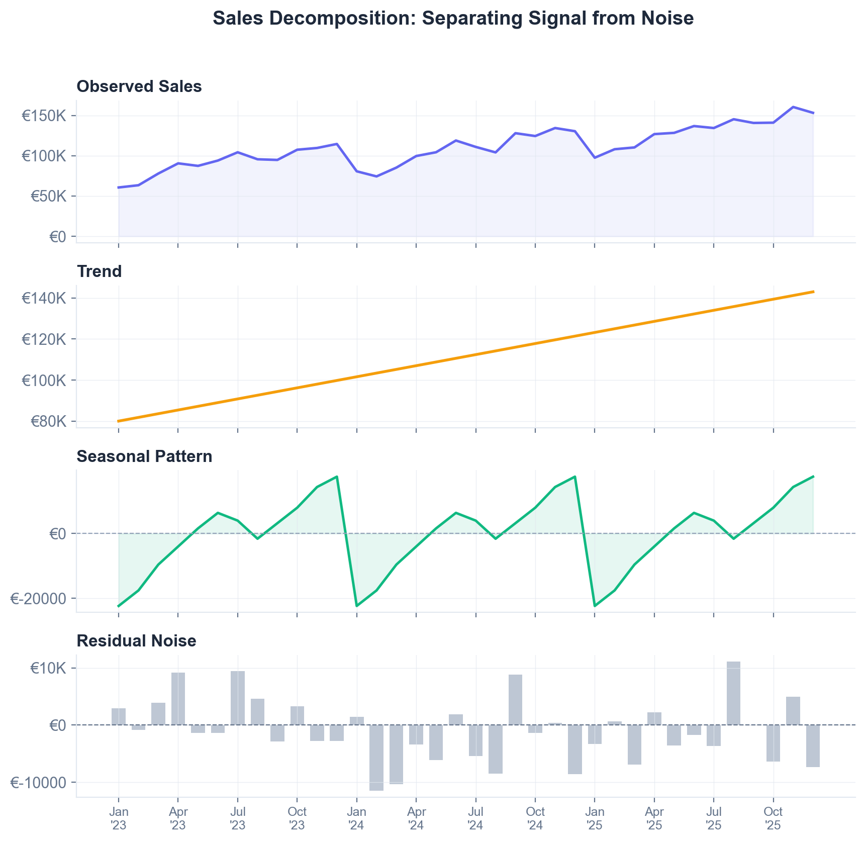 Why this matters: If you forecast total sales without separating these components, you'll either overreact to noise or miss the seasonal pattern entirely. Both lead to poor decisions.