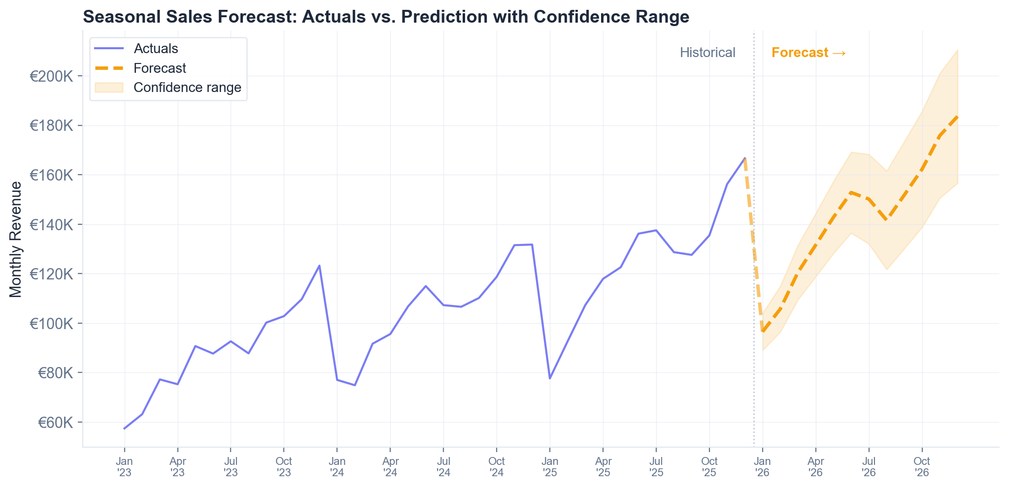 The chart above shows this approach applied to real data: historical actuals, a 12-month forecast, and a confidence band showing the range of likely outcomes. Notice how the forecast maintains the seasonal shape while projecting the upward trend forward.