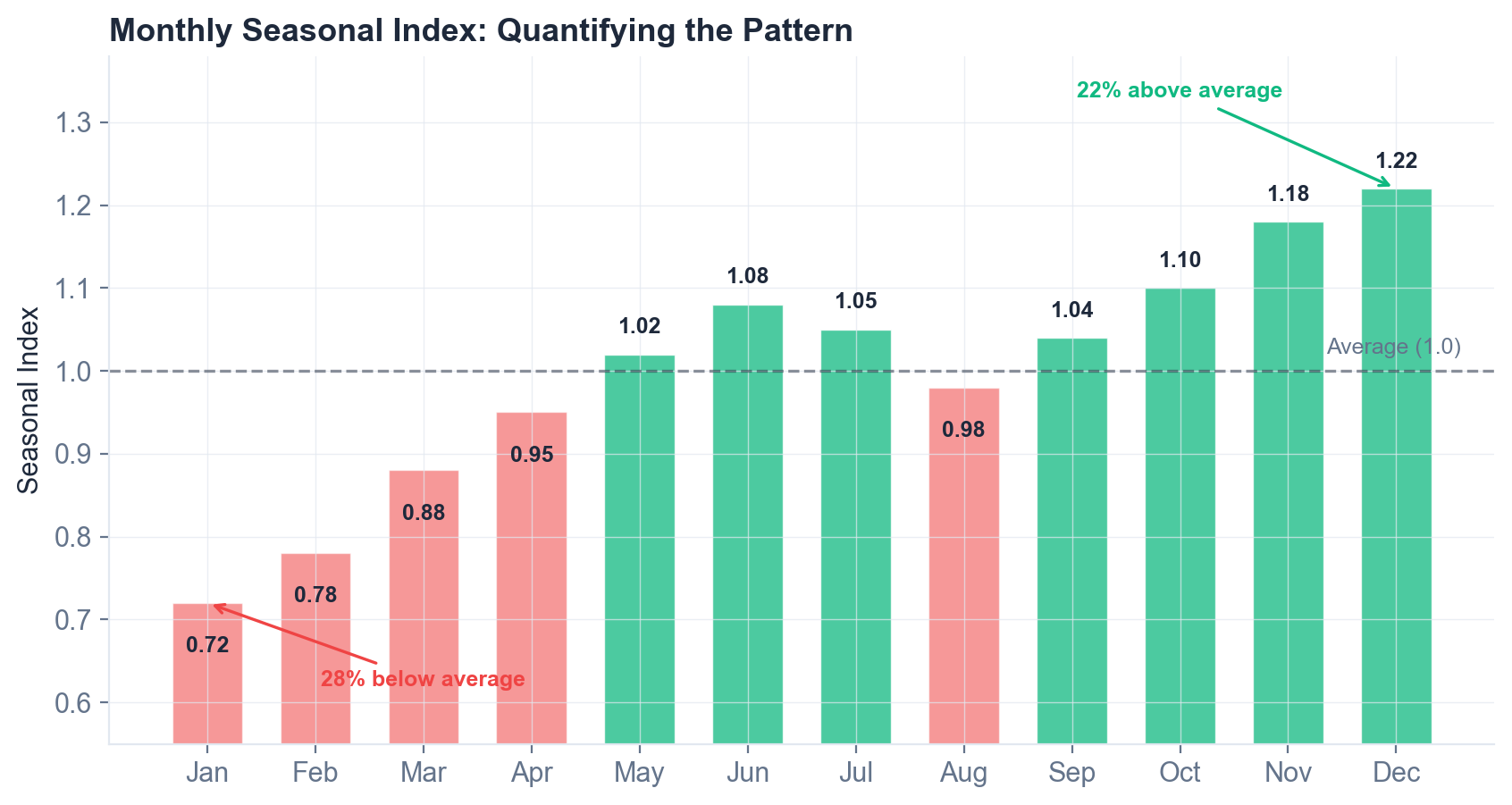 A seasonal index measures each month's deviation from the average. An index of 1.0 means that month is exactly average. An index of 1.25 means 25% above average. An index of 0.80 means 20% below average.