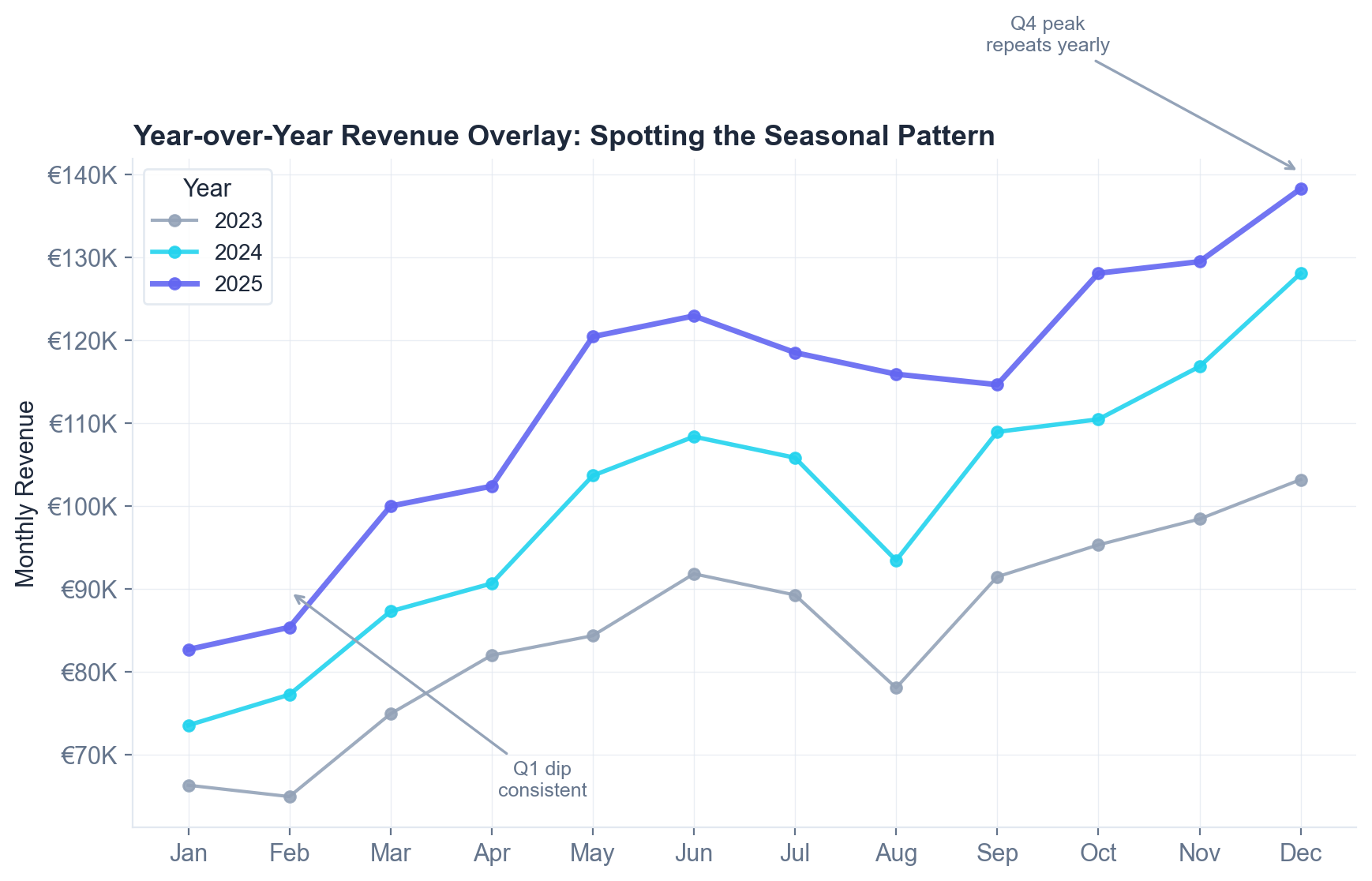 In the chart above, three years of monthly revenue are plotted on the same axis. The pattern is unmistakable: dips in Q1, a slow build through spring, a summer plateau, and a sharp Q4 spike. Year-over-year, the shape is consistent even though the level rises with the growth trend.
